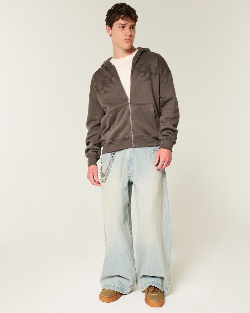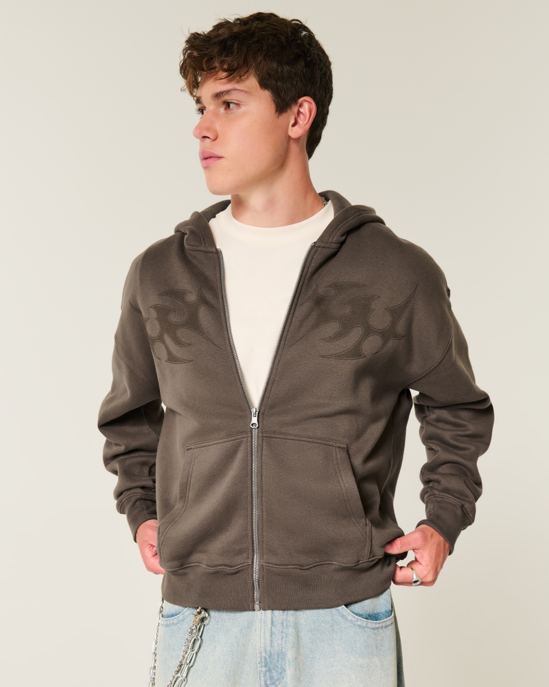 This super soft fleece hoodie has a full zip-up closure and front pockets. Long sleeves, hood. Boxy Fit. Imported.