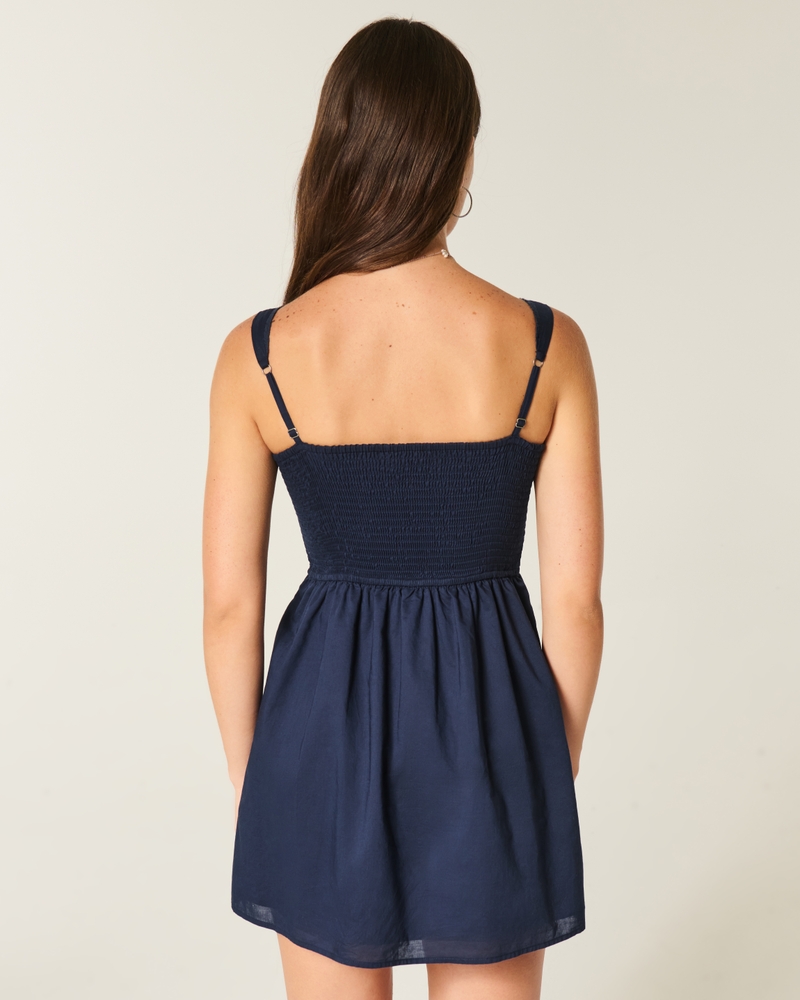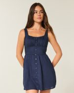 A flowy and super soft mini dress with front button details and lace trim along the neckline. Imported.