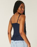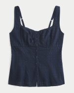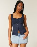 This cute top is made with super soft crosshatch fabric and features ruched detailing through the bust. Button details, adjustable straps, lace trim along the neckline. Slim Fit. Imported.