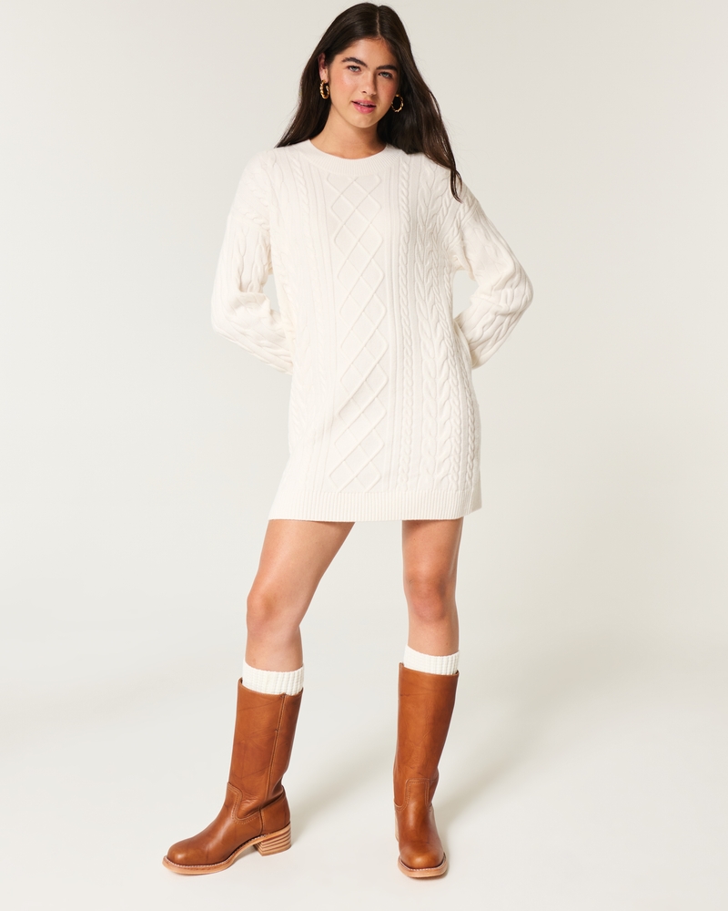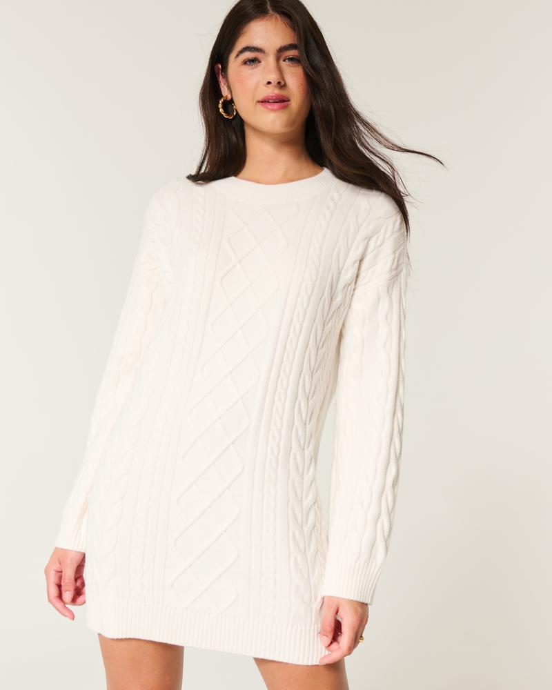A cozy and super soft sweater dress with classic cable-knit patterns. Crew neckline, long sleeves, ribbed trims. Imported.