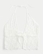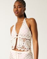 This cute swim cover up top is made with soft crochet-style fabric and features a tie-front closure and all-over stitched patterns. Halter straps, open back. Imported.