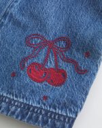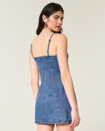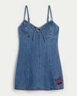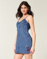 This cute denim mini dress features classic seam details and a tie at the center neckline. Adjustable straps. Imported.