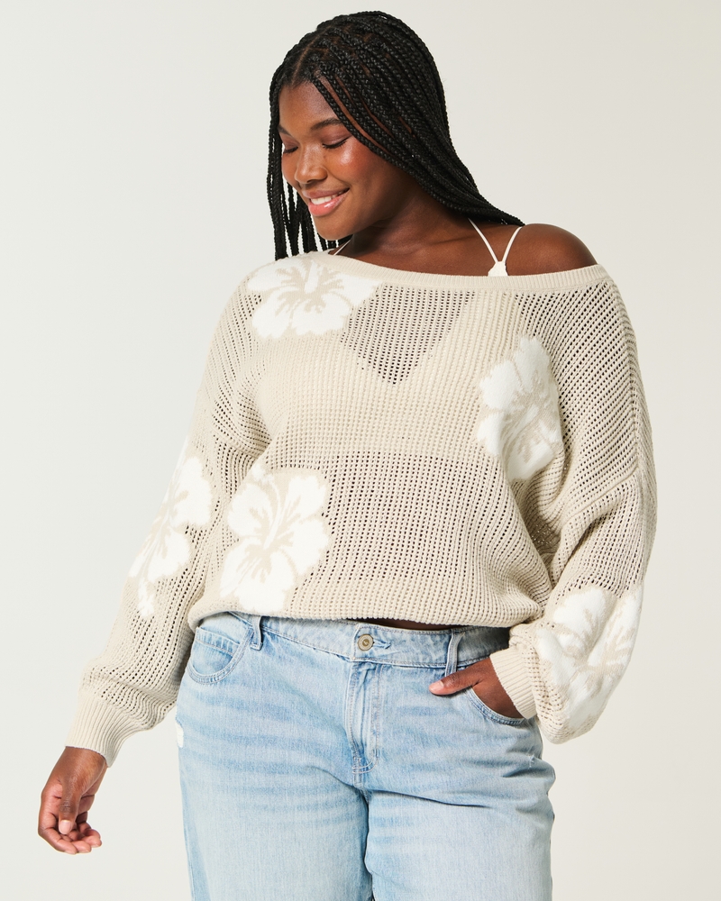Cozy and super soft, this sweater is made with stitchy textured fabric and features pretty floral graphics. Slouchy neckline can be worn off one shoulder. Ribbed trims, long sleeves. Easy Fit. Imported.