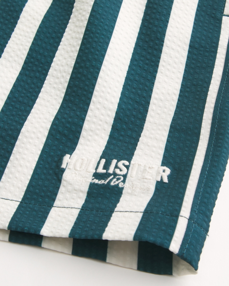 Shorter-length swim trunks that hit mid-thigh. Featuring comfortable 4-way stretch seersucker swim fabric and a 6" inseam. Front pockets, mesh lining, embroidered logo detail. Imported.