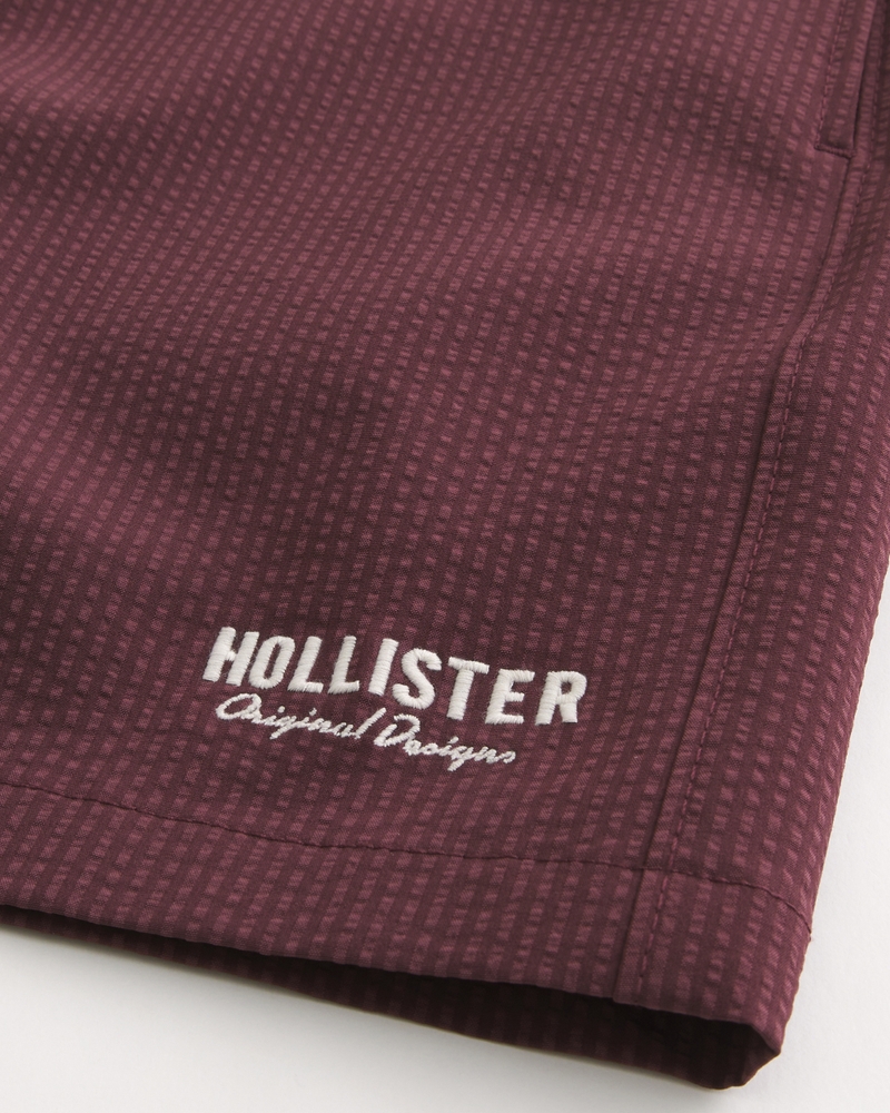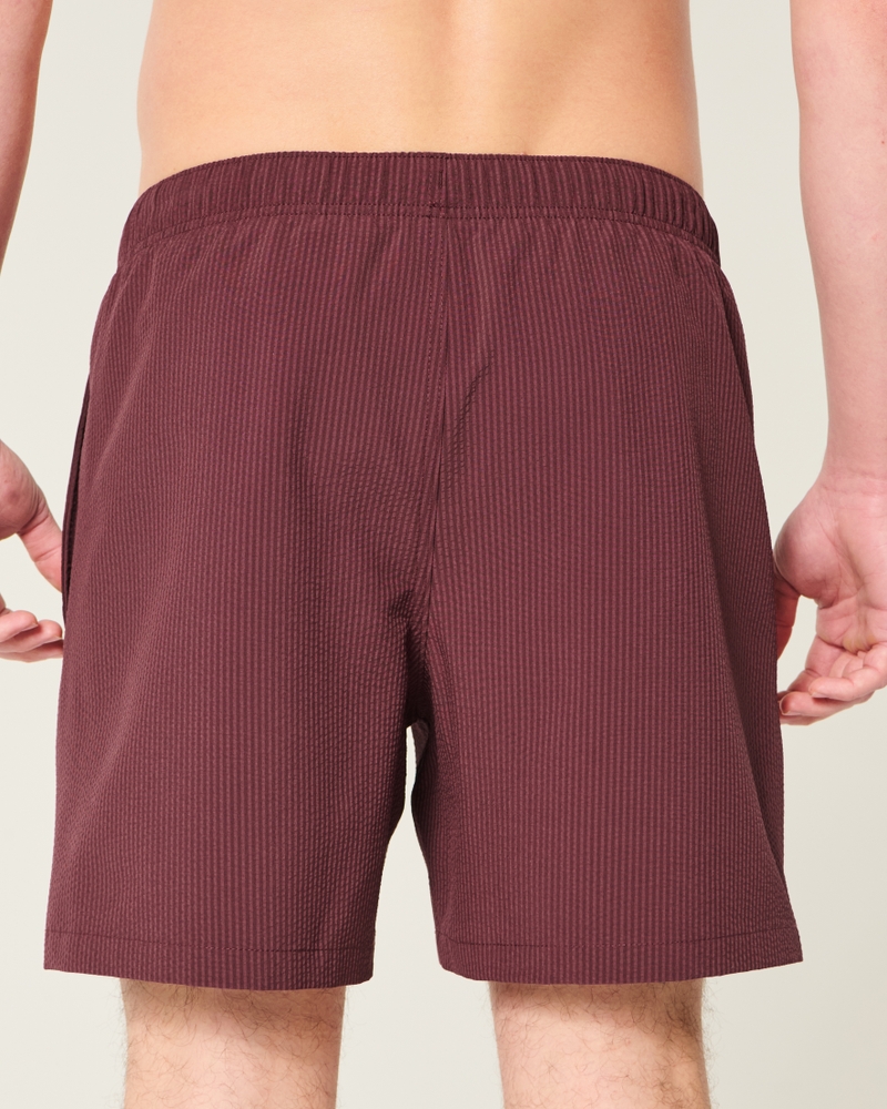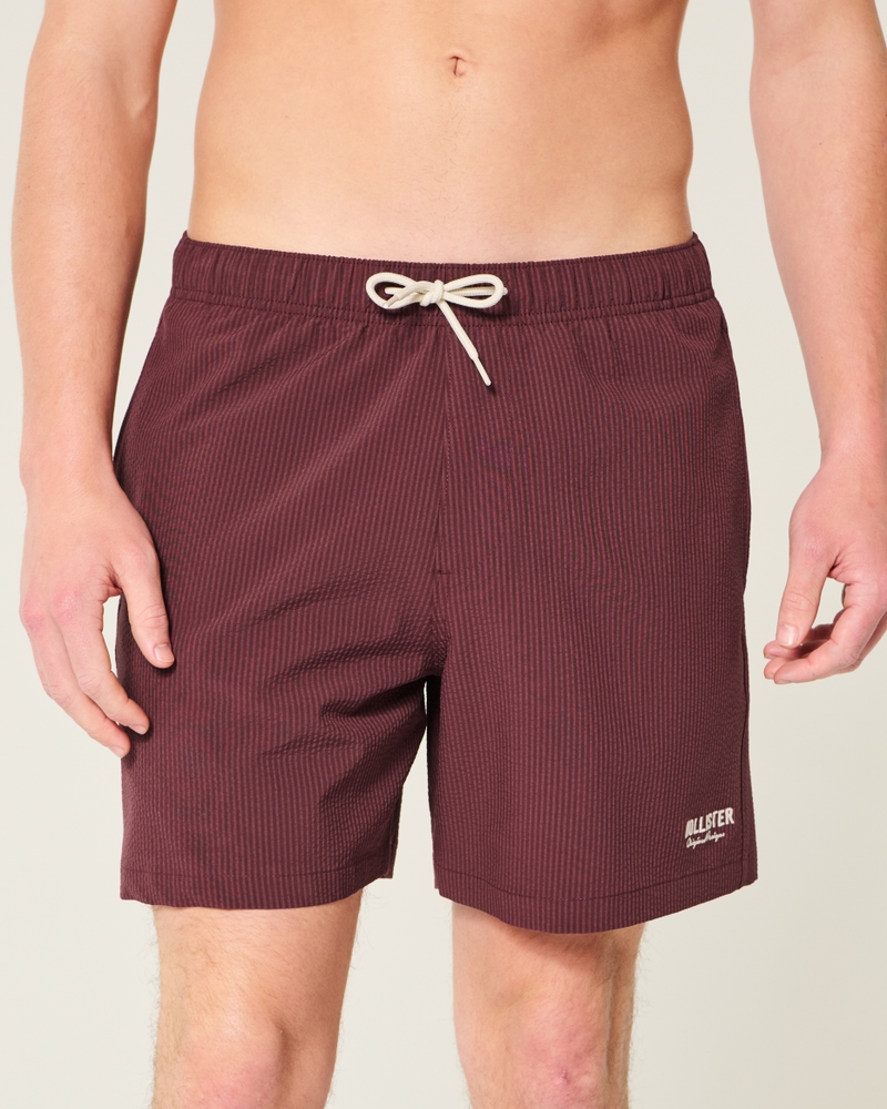 Shorter-length swim trunks that hit mid-thigh. Featuring comfortable 4-way stretch seersucker swim fabric and a 6" inseam. Front pockets, mesh lining, embroidered logo detail. Imported.