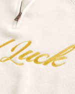 An ultra-comfortable and super soft sweater with a mock-neck collar, quarter-zip closure and raglan sleeves. Lunar New Year-inspired Good Luck graphic embroidery at the left chest and applique at the back. Ribbed trims, long sleeves. Relaxed Fit. Imported.