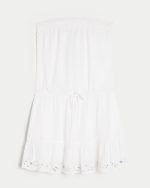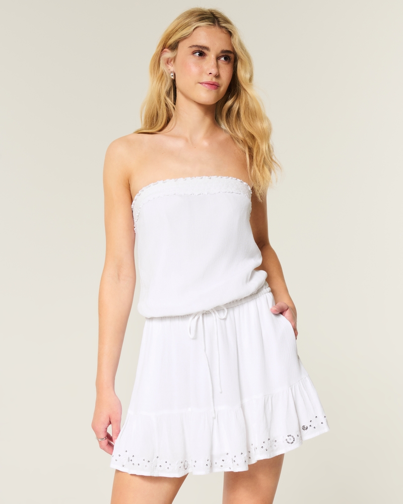 Pretty and super soft, this blouson mini dress features a drawstring waist and shine details at the hem. Strapless, soft banded neckline. Imported.