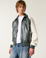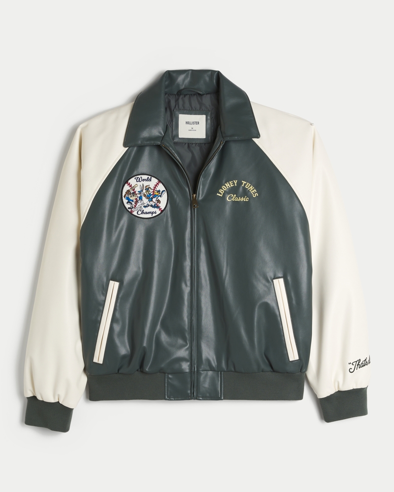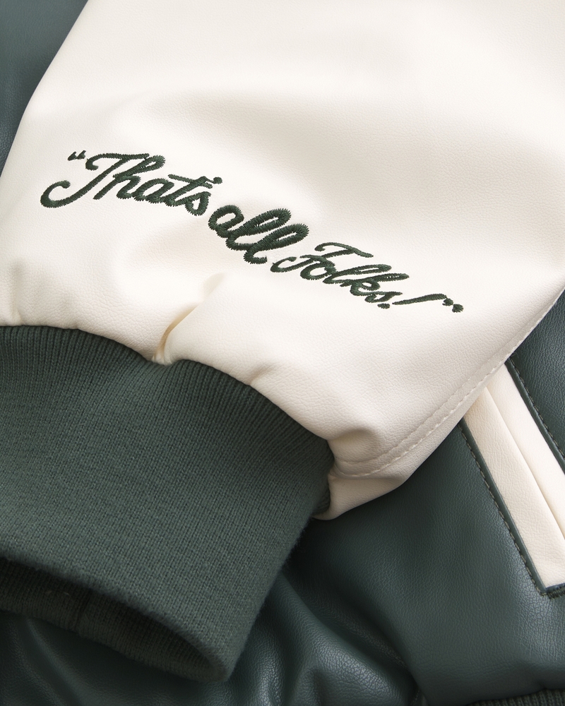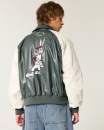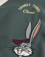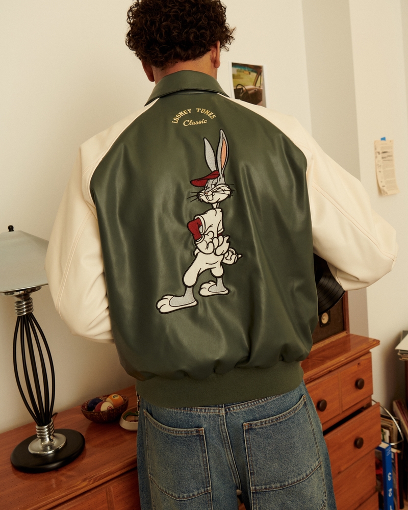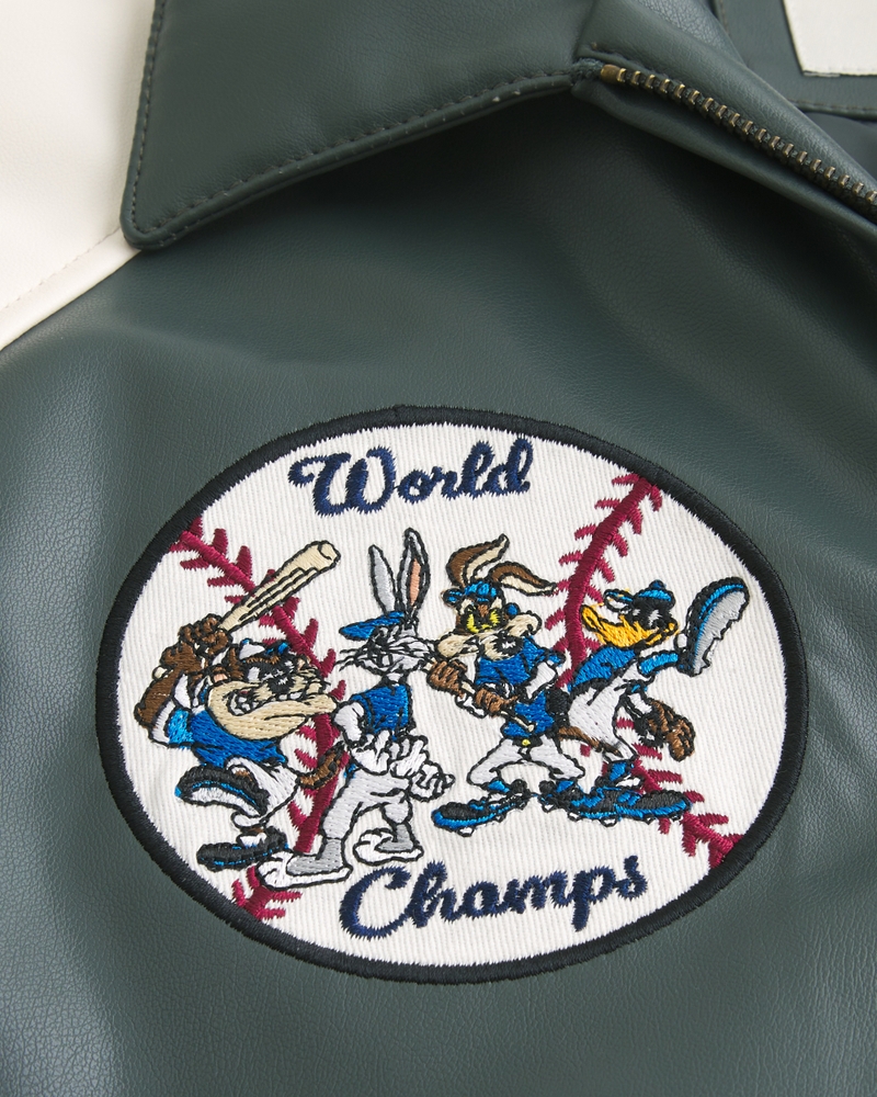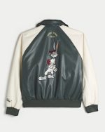 Vegan Leather Looney Tunes Graphic Jacket – dark olive and cream
