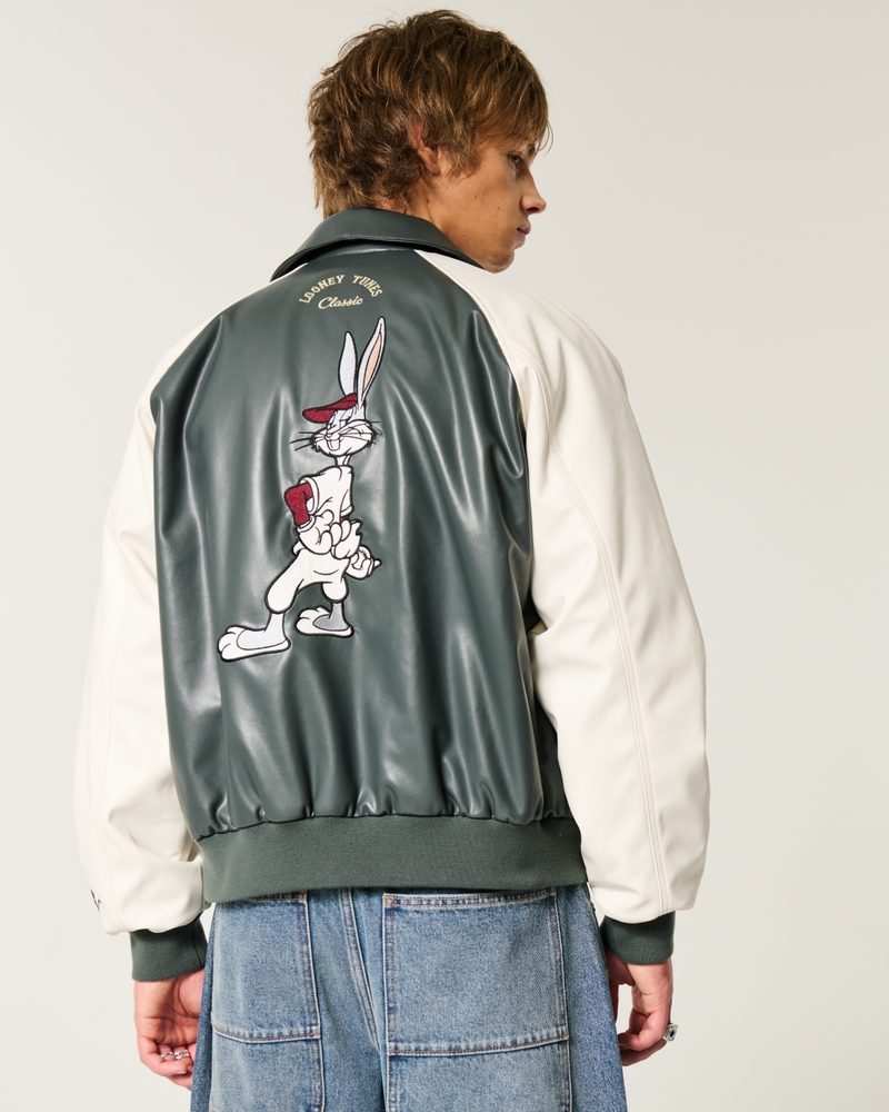 A classic jacket in faux leather, featuring official licensed Looney Tunes graphic applique and embroidery at the front and Bugs Bunny baseball graphic applique at the back. Full zip-up closure, pockets, banded hems. Imported.