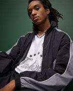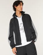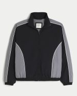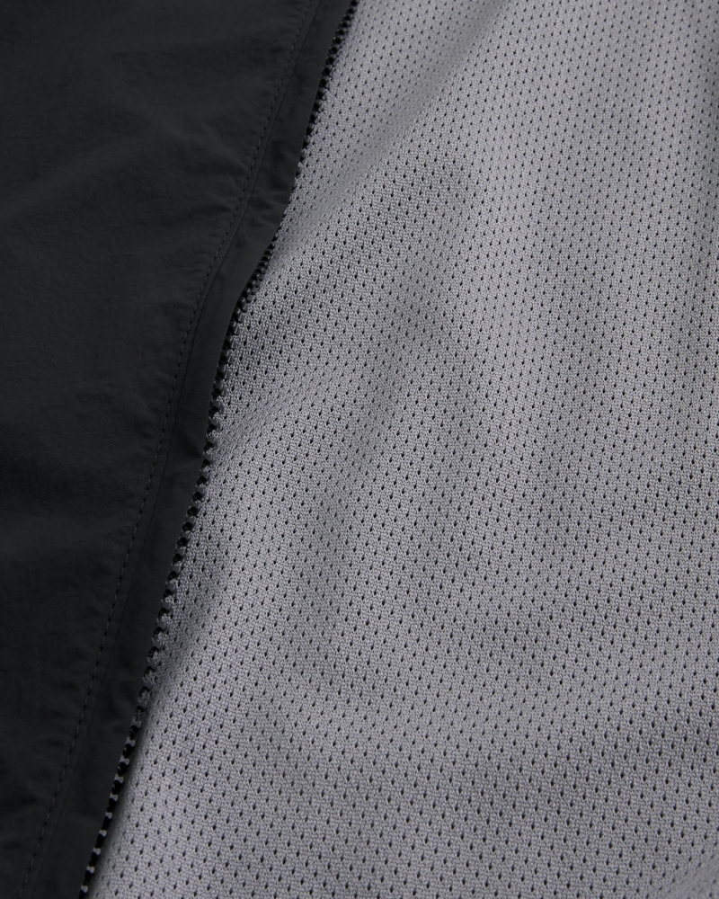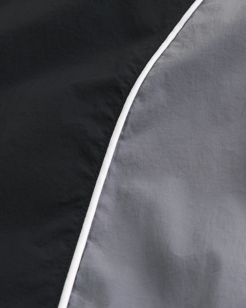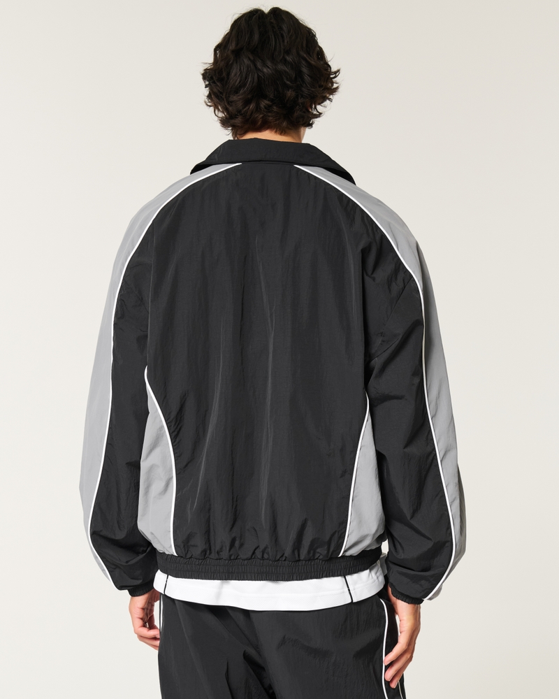 A classic windbreaker jacket with a full zip-up closure and mock-neck collar. Colorblock details, front pockets. Imported.